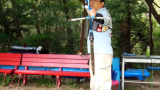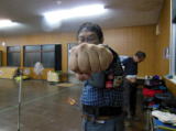 たしかに、肩関節などのに負荷を掛けて体を伸ばすのは理にかなっているのでしょう。しかし、これをすると、射線上でかなり場所を取るので、アウトドアで立ち位置に余裕があれば問題ないでしょうけど、インドアで余裕がない場合は、たとえ試射であっても後ろ(背中側)の選手にとって不快行為であり、危険でもあります。