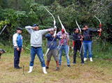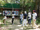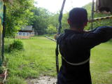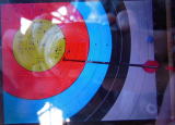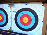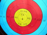 昨日作ったおみくじ的は、中心から外へ単純に運勢が並んでいるので、フツーに射てば大凶になることはありません。まず写真家さんが挑戦し無難に射って中吉としましたが、ハ号さんは、波平さんの「いつものようにフツーに射ったら大吉だから」とのアドバイスに、すっかり硬くなってしまい、3回引き戻して4回目にようやく射てたのですが、「大凶」という謀ったようなお笑いの結末に。